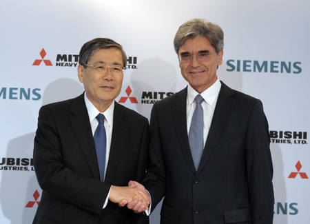 圖為德國西門子公司首席執(zhí)行官喬·凱澤(右)與三菱重工社長宮永俊一17日在法國巴黎的記者會(huì)上握手。
