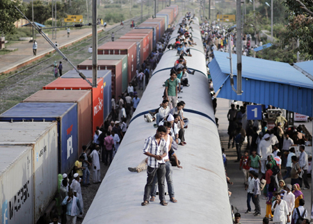 印度鐵道部長高達(dá)8日宣布鐵路系統(tǒng)改革計(jì)劃,包括鐵路系統(tǒng)對私人資本和外資開放,并將盡快建設(shè)高鐵。印度鐵路部門是印最大國有資產(chǎn)之一,由于經(jīng)營不善,連年虧本,基礎(chǔ)設(shè)施年久失修,遠(yuǎn)遠(yuǎn)不能滿足國內(nèi)乘客需求,經(jīng)常發(fā)生安全事故。 圖為,7日在印度洛尼,乘客搭乘一列超載的火車出行。