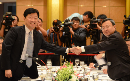 7月14日,中國商務(wù)部部長助理王受文(前右)和韓國通商產(chǎn)業(yè)資源部部長助理禹泰熙(前左)在談判前握手。