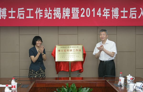 7月18日上午,中國出口信用保險公司(以下簡稱“中國信!保┎┦亢罂蒲泄ぷ髡窘遗启2014級博士后入站儀式舉行,中國信保總經(jīng)理羅熹和對外經(jīng)濟貿(mào)易大學(xué)黨委書記王玲共同為博士后科研工作站揭牌。