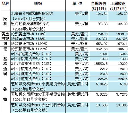 國際大宗商品期貨價格明細(xì)表[2014-8-4]