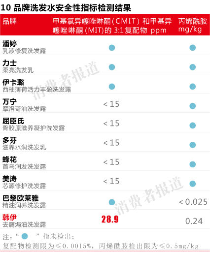 第三方權(quán)威檢測(cè)機(jī)構(gòu)檢測(cè)結(jié)果發(fā)現(xiàn),在安全性方面,韓伊洗發(fā)水當(dāng)中的兩種防腐劑——甲基異噻唑啉酮(MIT)和甲基氯異噻唑啉酮(CMIT)復(fù)配物含量為28.9ug/g,超標(biāo)近兩倍,可能易引發(fā)過(guò)敏;同時(shí)并檢出可能致癌物丙烯酰胺,疑似添加了業(yè)內(nèi)早已淘汰的增稠劑。