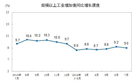 2014年7月份,規(guī)模以上工業(yè)增加值同比實(shí)際增長9.0%(以下增加值增速均為扣除價(jià)格因素的實(shí)際增長率),比6月份回落0.2個(gè)百分點(diǎn)。從環(huán)比看,7月份比上月增長0.68%。1-7月份,規(guī)模以上工業(yè)增加值同比增長8.8%。