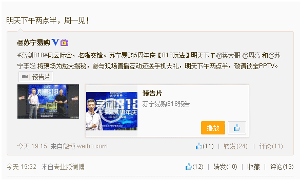 昨日蘇寧易購(gòu)官微稱將于8月4日,即今日通過(guò)PPTV發(fā)布蘇寧易購(gòu)818新玩法,蘇寧云商運(yùn)營(yíng)總部執(zhí)行副總裁李斌微博透露發(fā)布時(shí)間為今日下午兩點(diǎn)半。記者聯(lián)系蘇寧易購(gòu)市場(chǎng)人士,其證實(shí)PPTV將現(xiàn)場(chǎng)直播“亮劍818”高端訪談節(jié)目,屆時(shí)李斌現(xiàn)場(chǎng)將詳細(xì)釋疑百日會(huì)戰(zhàn)和818玩法懸疑。