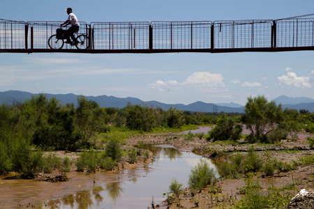 墨西哥索諾拉州烏勒斯地區(qū)一個銅礦日前泄漏了4萬立方米的硫酸,對索諾拉河的造成嚴(yán)重污染。受此事故影響,12日,墨西哥7個市鎮(zhèn)的20000名居民的供水而受到限制。墨西哥國家人權(quán)委員會稱正在對事故進行調(diào)查。 圖為12日一名烏勒斯地區(qū)居民騎車從索諾拉河上的吊橋經(jīng)過。