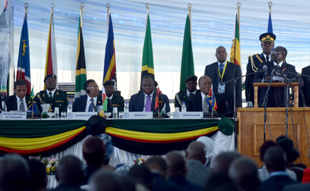 圖為17日津巴布韋總統(tǒng)穆加貝(前右一)在南部非洲發(fā)展共同體峰會上發(fā)言。