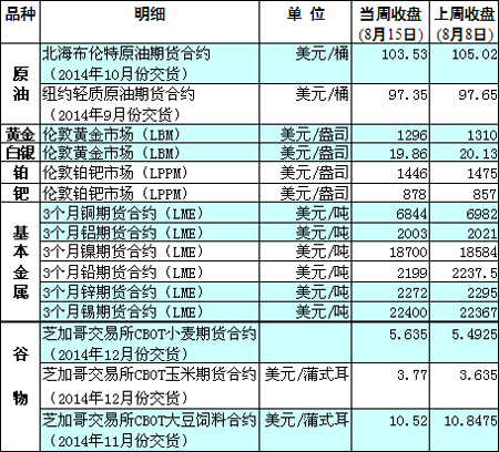 國際大宗商品期貨價格明細(xì)表[2014-8-18]