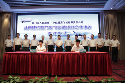 8月19日,全國首個(gè)通用航空綜合體項(xiàng)目——荊門愛飛客鎮(zhèn)合作建設(shè)在京舉行簽約儀式,中航工業(yè)通飛總經(jīng)理曲景文與荊門市市長肖菊華分別代表雙方在合作協(xié)議上簽字。湖北省副省長許克振、中國航空工業(yè)集團(tuán)公司(以下簡稱中航工業(yè))總經(jīng)理譚瑞松、副總經(jīng)理徐占斌、吳獻(xiàn)東,荊門市市委書記萬勇等出席簽約儀式。