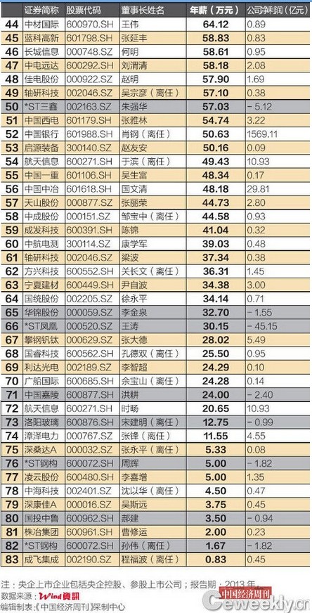 近日,《中國經(jīng)濟(jì)周刊》、中國經(jīng)濟(jì)研究院聯(lián)合Wind資訊推出2013年央企上市公司董事長(zhǎng)薪酬排行榜。央企上市公司包括央企控股、參股的上市公司,數(shù)據(jù)來自相關(guān)公司2013年年報(bào)。