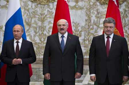圖為當(dāng)日俄羅斯總統(tǒng)普京(左)、白俄羅斯總統(tǒng)盧卡申科(中)、烏克蘭總統(tǒng)波羅申科在會談前合影。