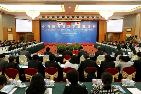 9月1日,中日韓自貿(mào)區(qū)第五輪談判在北京舉行。中國商務(wù)部部長助理王受文、日本外務(wù)省副部級審議官長嶺安政和韓國產(chǎn)業(yè)通商資源部部長助理禹泰熙率團與會。本輪談判將持續(xù)5天,三方主要就貨物貿(mào)易的降稅模式、服務(wù)貿(mào)易和投資的開放等議題展開磋商,并就協(xié)定的范圍和領(lǐng)域交換意見。