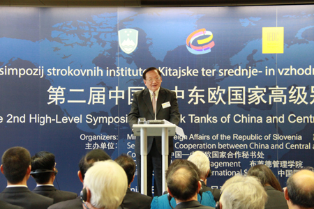 第二屆中國-中東歐國家高級別智庫研討會3日在斯洛文尼亞布萊德湖畔舉行。斯洛文尼亞總統(tǒng)帕霍爾會見了中國前國務委員唐家璇和外交部副部長王超一行。唐家璇稱中國—中東歐國家合作發(fā)展勢頭強勁,正在成為中歐關(guān)系發(fā)展新的重要引擎。帕霍爾也表示愿意進一步強化斯中關(guān)系,推動中國—中東歐國家之間的合作。 圖為唐家璇在研討會開幕式上致辭。
