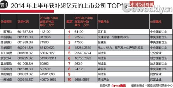 《中國經(jīng)濟周刊》中國經(jīng)濟研究院根據(jù)Wind資訊數(shù)據(jù)統(tǒng)計發(fā)現(xiàn),在公布2014年半年報的上市公司中,有88.1%的上市公司收到政府補助,部分公司所獲政府補助甚至遠遠高于歸屬于母公司股東的凈利潤。這些公司遍布制造業(yè)、金融業(yè)、房地產(chǎn)業(yè),其中有中央國有企業(yè)也有民營企業(yè)。一些地方政府甚至定期為被打上退市風險警示的公司發(fā)放政府補助,企業(yè)因此“扭虧為盈”。