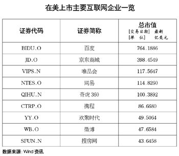 實(shí)際上,除了阿里巴巴之外,近年來(lái),大量的互聯(lián)網(wǎng)企業(yè)在海外相繼上市。美國(guó)當(dāng)?shù)貢r(shí)間5月22日,京東正式在納斯達(dá)克掛牌上市,股票代碼為“JD”,截至記者發(fā)稿時(shí),京東的市值已經(jīng)達(dá)到了398億美元。WIND統(tǒng)計(jì)數(shù)據(jù)顯示,截至目前,在港上市的騰訊控股市值為11555億港元,在美上市的百度和奇虎360的市值則分別為764億美元和100億美元。按照目前的匯率計(jì)算,僅上述4家互聯(lián)網(wǎng)企業(yè),其市值就已經(jīng)達(dá)到1.69萬(wàn)億元人民幣。