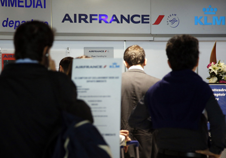 法航飛行員于15日起舉行為期一周的罷工,以抗議公司削減開支、發(fā)展廉價航空的計劃。法航在官網(wǎng)說大約有48%的航班可以在15日起飛,不過不排除還有最后變動的可能。 圖為當(dāng)日在法國尼斯國際機場,乘客在法航值機柜臺旁等待辦理手續(xù)。
