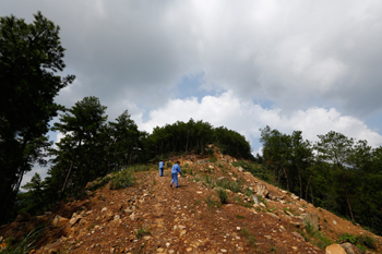 翻過(guò)一座山頭之后,終于來(lái)到了一塊相對(duì)平坦的地方,可眼前半米高的雜草讓人根本無(wú)法前行。站長(zhǎng)幸健鋒很熟練地拿出了砍刀,揮刀向雜草劈去,雜草在刀鋒面前紛紛退讓,不一會(huì),一條可供通行的小道便顯露了出來(lái)。兩位隊(duì)員怕我們有危險(xiǎn),拿著木棒先蹚了過(guò)去。