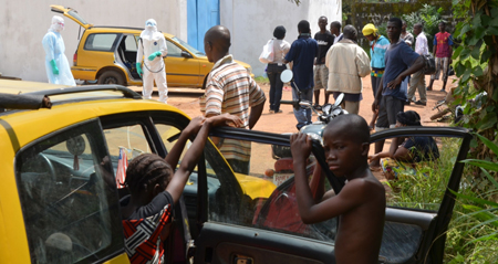 圖為9月23日,在利比里亞蒙羅維亞,一名患者乘坐出租車來(lái)到新建成的埃博拉治療中心“小島診所”后,工作人員給出租車消毒。