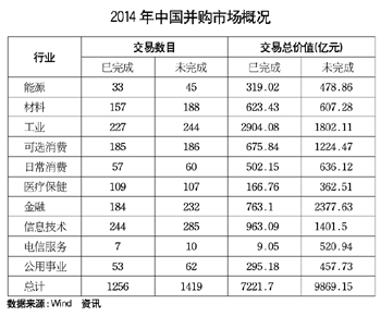 Wind統(tǒng)計數(shù)據(jù)則顯示,僅2014年以來,中國公司已經(jīng)完成的并購交易數(shù)目就達到1256宗,交易總價值達到7222億元;未完成的并購交易數(shù)目則達到1419宗,涉及金額更是高達9869億元,合計達到1.7萬億元之巨。相比之下,在重組相當活躍的2013年,全年并購交易也只有1296家次,金額合計6330億元。