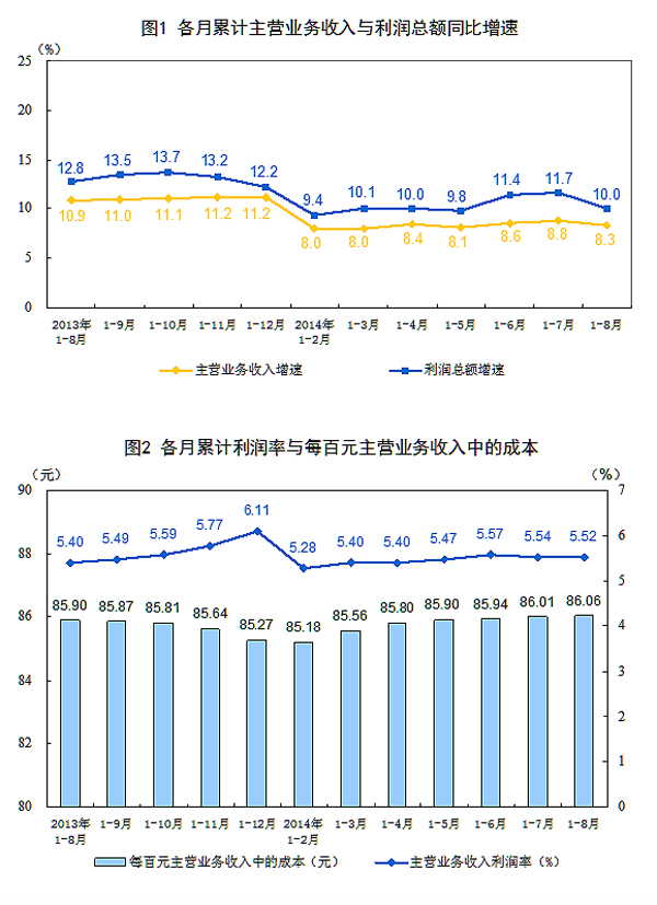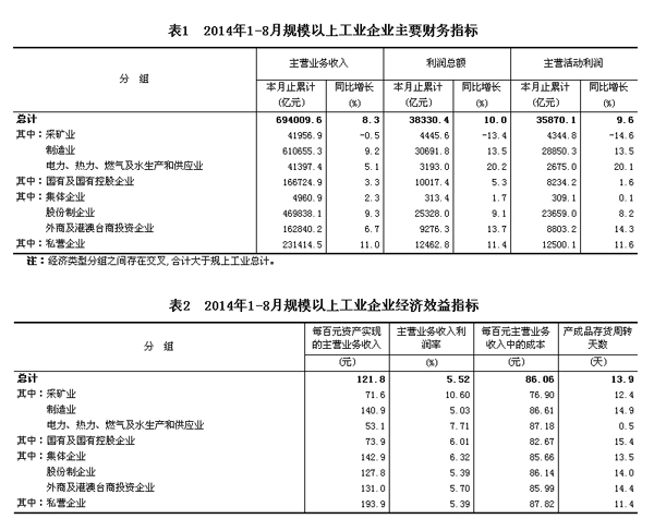 1-8月份,規(guī)模以上工業(yè)企業(yè)主營業(yè)務(wù)收入利潤率為5.52%,每百元主營業(yè)務(wù)收入中的成本為86.06元,每百元資產(chǎn)實現(xiàn)的主營業(yè)務(wù)收入為121.8元,產(chǎn)成品存貨周轉(zhuǎn)天數(shù)為13.9天。
