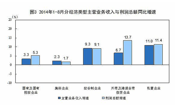 1-8月份,在規(guī)模以上工業(yè)企業(yè)中,國有及國有控股企業(yè)實現(xiàn)利潤總額10017.4億元,同比增長5.3%;集體企業(yè)實現(xiàn)利潤總額313.4億元,增長1.7%;股份制企業(yè)實現(xiàn)利潤總額25328億元,增長9.1%;外商及港澳臺商投資企業(yè)實現(xiàn)利潤總額9276.3億元,增長13.7%;私營企業(yè)實現(xiàn)利潤總額12462.8億元,增長11.4%。