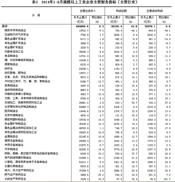 1-8月份,全國規(guī)模以上工業(yè)企業(yè)實現(xiàn)利潤總額38330.4億元,同比增長10%,增速比1-7月份回落1.7個百分點;實現(xiàn)主營活動利潤35870.1億元,同比增長9.6%,增速比1-7月份回落1.6個百分點。