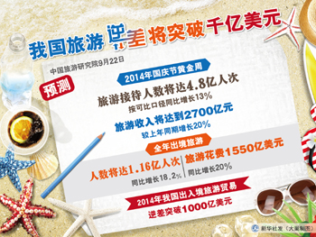 根據(jù)《國(guó)務(wù)院關(guān)于促進(jìn)旅游業(yè)改革發(fā)展的若干意見(jiàn)》,到2020年,境內(nèi)旅游總消費(fèi)額將達(dá)到5.5萬(wàn)億元,城鄉(xiāng)居民年人均出游4.5次,旅游業(yè)增加值占國(guó)內(nèi)生產(chǎn)總值的比重超過(guò)5%。