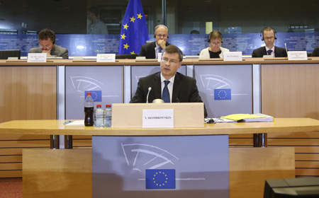 10月6日,在比利時首都布魯塞爾,歐盟委員會歐元與社會事務候任委員、前拉脫維亞總理東布羅夫斯基斯(前)出席歐洲議會的聽證會并講話。