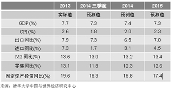 清華大學(xué)中國與世界經(jīng)濟研究中心12日預(yù)測,2014年中國國內(nèi)生產(chǎn)總值(GDP)同比增長7.4%,2015年增長7.3%。而在10日,中國社會科學(xué)院發(fā)布的預(yù)測結(jié)果為:今年增長7.3%,明年為7%。多位學(xué)者和政府人士建議,將明年GDP增長預(yù)期目標定在7%,以便讓政府的宏觀調(diào)控更具主動性。