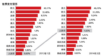 環(huán)球同業(yè)銀行金融電訊協(xié)會(SWIFT)數(shù)據(jù)顯示,人民幣繼美國之后在2013年12月取代了歐元,成為全球貿(mào)易金融中使用率第二高的貨幣。另外,人民幣已經(jīng)躍升為第七大國際支付貨幣。星展銀行經(jīng)濟學(xué)家周洪禮表示,隨著境外普及率的不斷提高,人民幣國際化機制正逐漸成形。盡管人民幣并未達到基本可兌換的地位,但很多國家的央行已經(jīng)開始將人民幣納入該國的官方外幣資金。