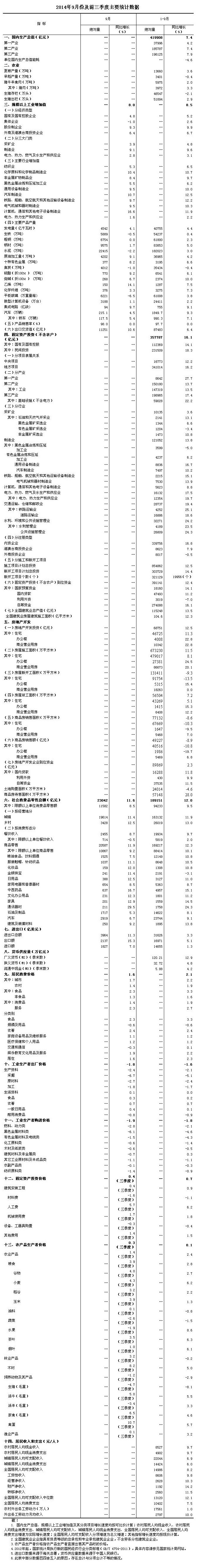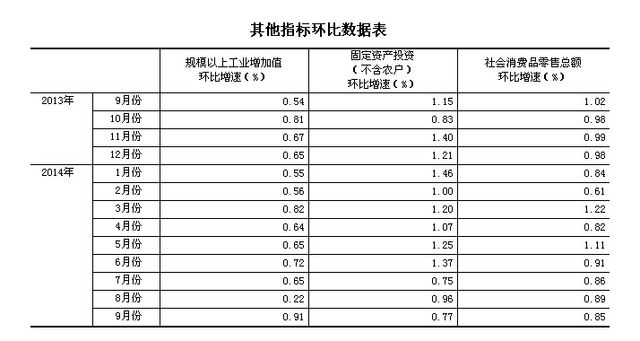 。2)根據(jù)季節(jié)調(diào)整模型自動修正結(jié)果,對近一年來各期國內(nèi)生產(chǎn)總值、規(guī)模以上工業(yè)增加值、固定資產(chǎn)投資(不含農(nóng)戶)、社會消費品零售總額環(huán)比增速進(jìn)行修訂。修訂結(jié)果及2014年三季度GDP環(huán)比數(shù)據(jù)、2014年9月份其他指標(biāo)環(huán)比數(shù)據(jù)如下: