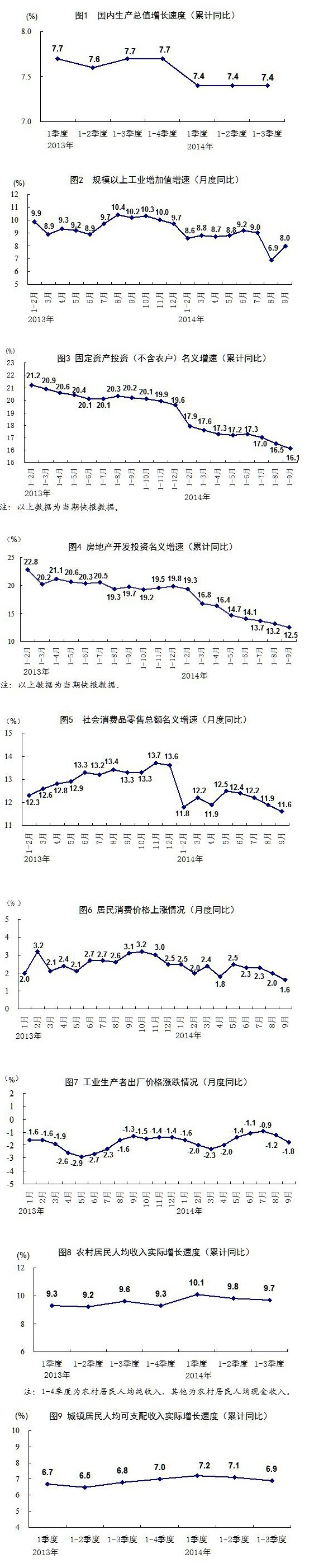 2013年各季度及2014年一、二、三季度GDP環(huán)比增速分別為1.6%、1.8%、2.3%、1.7%、1.5%、2.0%和1.9%。