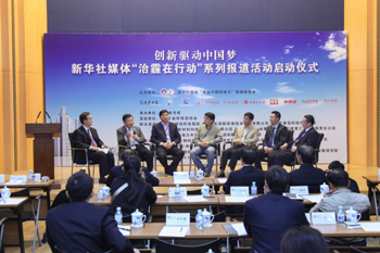 新華社媒體“發(fā)現(xiàn)中國創(chuàng)造力”組委會10月25日正式啟動2014年“治霾在行動”活動。圖為活動當天第二場討論“治霾突圍之路”! ∮浾