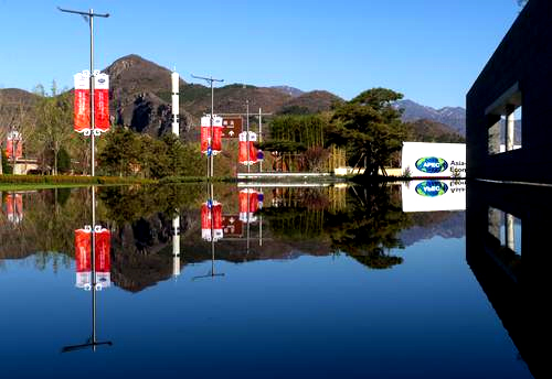 11月3日,APEC彩旗和標(biāo)識(shí)倒映在雁棲湖新聞中心外的水面上。