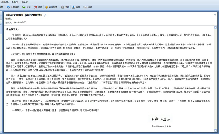 在11月10日,蘇寧董事長(zhǎng)張近東發(fā)布內(nèi)部動(dòng)員令,號(hào)召18萬蘇寧人為O2O購物節(jié)沖刺,打破傳統(tǒng)的純線上網(wǎng)購模式,把“O2O模式變成消費(fèi)者看得見、摸得著的生活方式”。