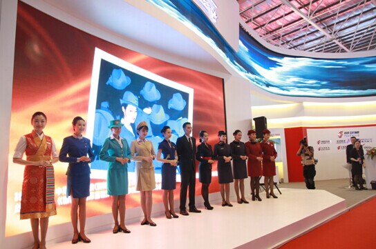 圖一:國航展臺有兩大亮點,一是由美麗的空姐現(xiàn)場展示從建國初期一直到現(xiàn)在的各套空乘制服,從歷史變遷中讓人體會國航發(fā)展強大的文化支撐。二是國航系旗下山東航空,深圳航空,西藏航空,北京航空,澳門航空,內(nèi)蒙古航空等企業(yè)與國航股份一起亮相,體現(xiàn)了國航多品牌協(xié)同發(fā)展的能力。攝影:林玉。