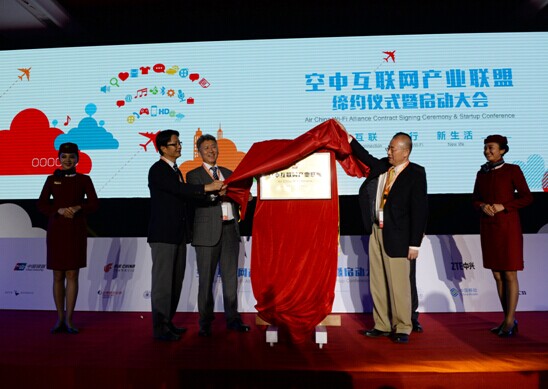 圖四:11日晚,國航牽頭成立了國內(nèi)首個“空中互聯(lián)網(wǎng)產(chǎn)業(yè)聯(lián)盟”,旨在為機艙乘客提供優(yōu)質(zhì)的實時互聯(lián)網(wǎng)服務(wù)。該聯(lián)盟由30多家各類企業(yè)組成,既有東軟,京東,銀河證券,優(yōu)酷土豆這樣的業(yè)界知名企業(yè),也有類似于好十傳媒這樣的專業(yè)企業(yè)。攝影:李賀。