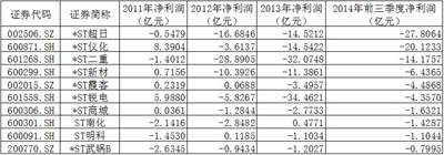 WIND統(tǒng)計(jì)數(shù)據(jù)顯示,截至目前滬深兩市風(fēng)險(xiǎn)警示類股票共計(jì)有50只。從最近一個(gè)季度的財(cái)務(wù)指標(biāo)來看,其中每股凈資產(chǎn)為負(fù)的有7家,分別為*ST武鍋B、*ST超日、*ST昌九、*ST商城、ST南化、*ST霞客和*ST傳媒,每股凈資產(chǎn)分別為-4.86元、-3.70元、-0.61元、-0.54元、-0.52元、-0.23元和-0.01元。包括*ST鳳凰等在內(nèi)的13只風(fēng)險(xiǎn)警示類股票的每股凈資產(chǎn)也在1元以下。從盈利情況來看,上述50只股票中,2014年前三季度共計(jì)有27家出現(xiàn)虧損,有18家企業(yè)2012年、2013年連續(xù)虧損并在今年前三個(gè)季度繼續(xù)虧損,可謂“命懸一線”,其中,*ST武鍋B、*ST二重、*ST超日2011年、2012年、2013年和2014年前三季度均呈現(xiàn)虧損狀態(tài),更是一只腳已經(jīng)踏入了退市程序。