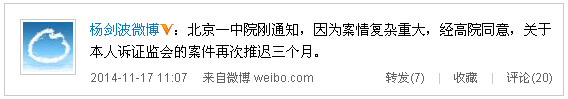 11月17日,楊劍波發(fā)布微博稱,“北京一中院剛通知,因為案情復(fù)雜重大,經(jīng)高院同意,關(guān)于本人訴證監(jiān)會的案件再次推遲三個月。”據(jù)知,這已經(jīng)是北京一中院第三次下達延期宣判的通知。