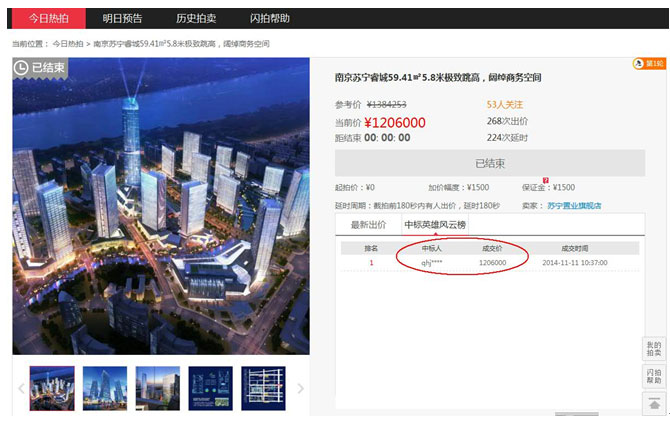 雙十一購物節(jié)如火如荼,正當(dāng)大家都在尋找最敗家的女人時(shí),在蘇寧第二屆O2O購物節(jié)上誕生了最“精明”的女人。11月11日10點(diǎn),家住南京市玄武的周女士經(jīng)過37分鐘的鏖戰(zhàn),最終用她老公的賬號在蘇寧閃拍頻道以120.6萬的出價(jià)拍得價(jià)值138.4萬元的南京蘇寧睿城商業(yè)用房,這比市場價(jià)低了近18萬元。