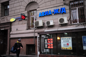 12月16日,在俄羅斯首都莫斯科,行人走過街邊的外幣兌換點(diǎn)! 記者