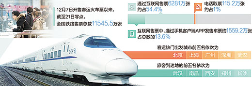 此外,12月12日上線的手機(jī)客戶端2.0版改善了用戶購(gòu)票體驗(yàn),簡(jiǎn)化了購(gòu)票操作,同時(shí)優(yōu)化了網(wǎng)站購(gòu)票流程。據(jù)介紹,春運(yùn)火車票開售以來(lái),手機(jī)客戶端發(fā)售車票占比13.6%,12306網(wǎng)站占比40.9%。