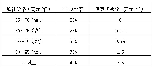 經(jīng)國(guó)務(wù)院批準(zhǔn),財(cái)政部決定從2015年1月1日起,將石油特別收益金起征點(diǎn)提高至65美元/桶。起征點(diǎn)提高后,石油特別收益金征收仍實(shí)行5級(jí)超額累進(jìn)從價(jià)定率計(jì)征。具體征收比率及速算扣除數(shù)見下表: