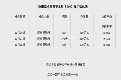央行今日公告,2014年11月份,人民銀行以利率招標(biāo)方式開展了短期流動性調(diào)節(jié)工具(SLO)操作。具體情況如下: