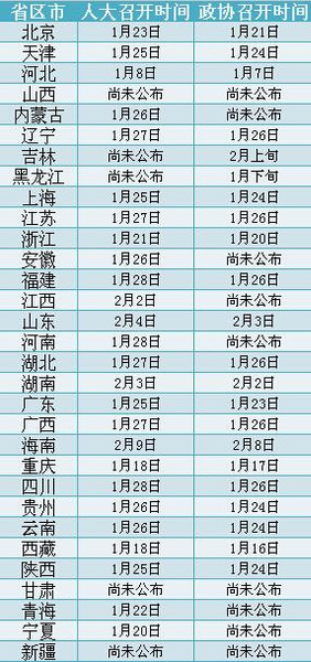 隨著1月7日、8日,河北政協(xié)和人大會(huì)議相繼召開,2015年地方兩會(huì)正式拉開帷幕。根據(jù)各地公布的會(huì)議日程,大部分省份兩會(huì)將集中在1月中下旬召開,最晚到2月上旬就會(huì)結(jié)束。