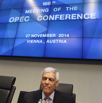 石油輸出國(guó)組織(歐佩克)部長(zhǎng)級(jí)會(huì)議11月27日在奧地利維也納在歐佩克總部舉行,主題是討論過(guò)去幾個(gè)月不斷下跌的油價(jià)走勢(shì)和2015年石油市場(chǎng)前景。圖為歐佩克秘書(shū)長(zhǎng)巴德里等待會(huì)議開(kāi)始! ⌒氯A社/路透 |