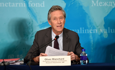 圖為當(dāng)日國際貨幣基金組織首席經(jīng)濟(jì)學(xué)家奧利維耶·布朗夏爾介紹《世界經(jīng)濟(jì)展望報(bào)告》最新預(yù)測。