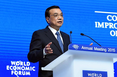 國務(wù)院總理李克強(qiáng)當(dāng)?shù)貢r間21日下午在瑞士達(dá)沃斯出席世界經(jīng)濟(jì)論壇2015年年會全會,并發(fā)表題為《維護(hù)和平穩(wěn)定,推動結(jié)構(gòu)改革,培育發(fā)展新動能》的特別致辭。