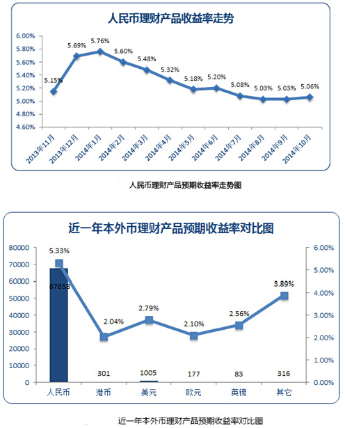大數(shù)據(jù)君:嗯,銀行類理財(cái)產(chǎn)品收益率雖不比P2P,但風(fēng)險(xiǎn)也小啊。請看大數(shù)據(jù):銀行類理財(cái)產(chǎn)品中,人民幣理財(cái)產(chǎn)品的平均預(yù)期收益率在監(jiān)測周期內(nèi)呈現(xiàn)出先揚(yáng)后抑的走勢,在2014年1月達(dá)到最高的5.76%,隨后逐漸下滑,到2014年10月平均預(yù)期收益率僅為5.06%。外幣理財(cái)產(chǎn)品平均收益率小幅上升,主要貨幣中,美元的平均預(yù)期收益率較高,為2.79%。