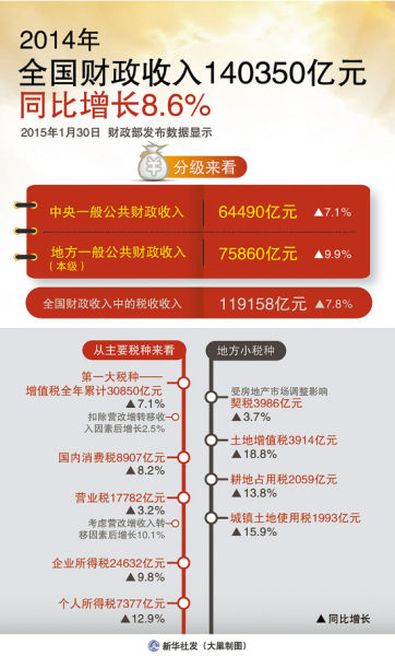 這一點(diǎn)表現(xiàn)很明顯,在稅收收入當(dāng)中,國內(nèi)增值稅是稅收項(xiàng)目里的“重頭”。受到去年工業(yè)生產(chǎn)增速放緩、工業(yè)生產(chǎn)者出廠價格下降等因素,2014年國內(nèi)增值稅為30850億元,同比增長7.1%,增幅偏低。