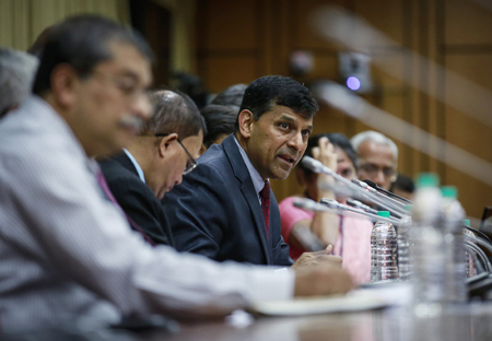 印度央行3日舉行貨幣政策會議決定,維持7.75%的基準(zhǔn)利率不變。印度央行行長拉詹說,該行正在等待印度通脹進(jìn)一步放緩的跡象,及政府定于2月28日發(fā)布的年度預(yù)算。 圖為當(dāng)日在印度孟買,拉詹在新聞發(fā)布會上講話。
